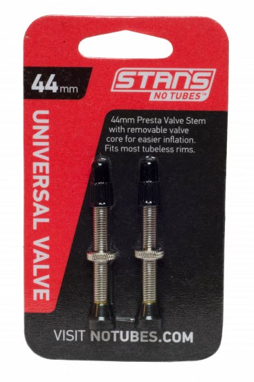 The original and still the best tubeless valve stem for most rims and a perfect fit for all Stan’s BST rim models. Weighs only 16g, 18g and 21g per valve respectively for the 35mm, 44mm and 55mm models. Durable brass construction. Removable valve core makes adding sealant easy. Fits up to 8mm valve hole. Sold as a pair.