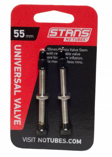 The original and still the best tubeless valve stem for most rims and a perfect fit for all Stan’s BST rim models. Weighs only 16g, 18g and 21g per valve respectively for the 35mm, 44mm and 55mm models. Durable brass construction. Removable valve core makes adding sealant easy. Fits up to 8mm valve hole. Sold as a pair.