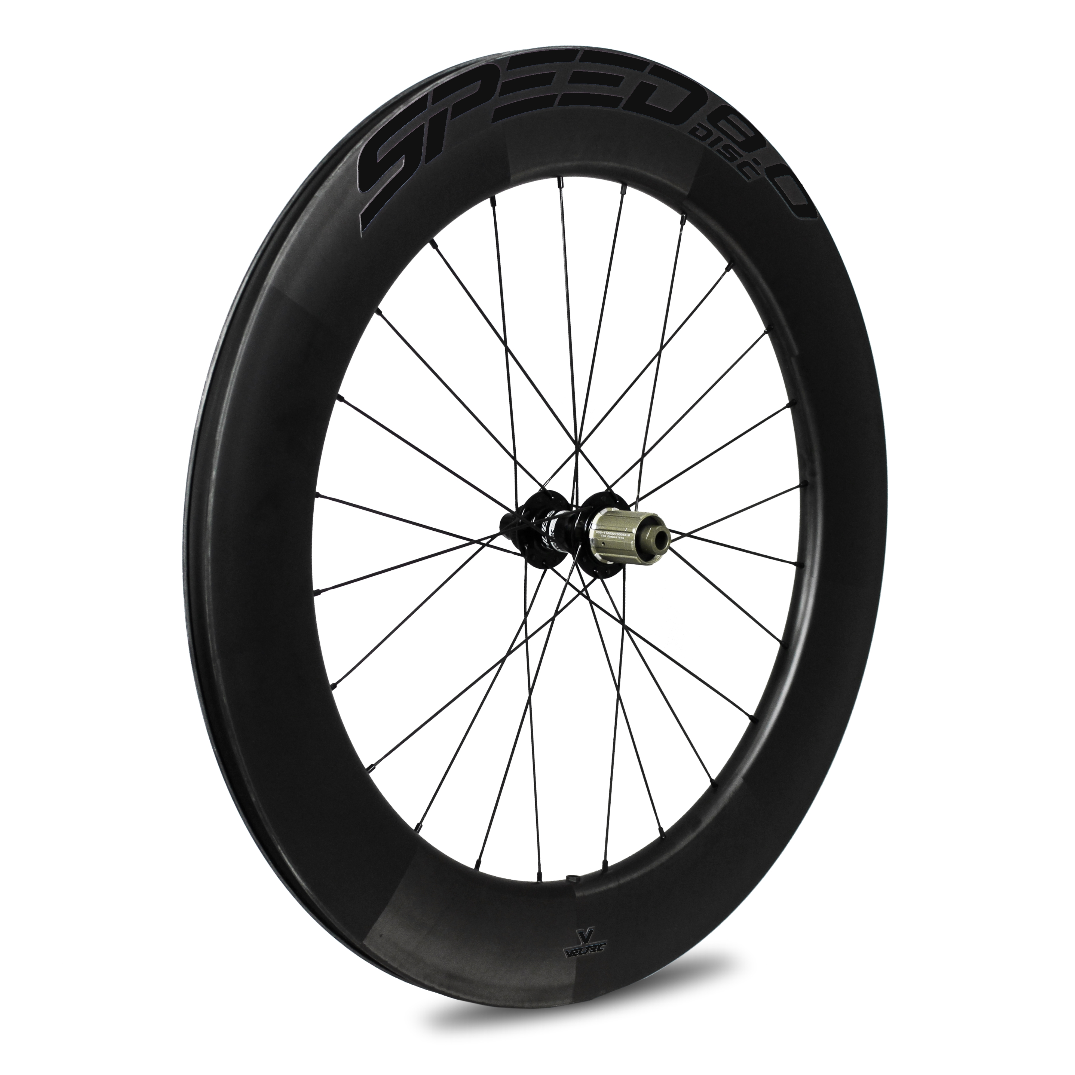 The Veltec Speed 8.0 Disc wheelset has an 83 millimeter high full carbon clincher rim and is therefore the highest version of the Speed Carbon Disc wheelset. The 19 millimeter wide and extremely aerodynamic rim is not only tubeless ready, but also allows the fitting of wider tires of up to 40 millimeters.